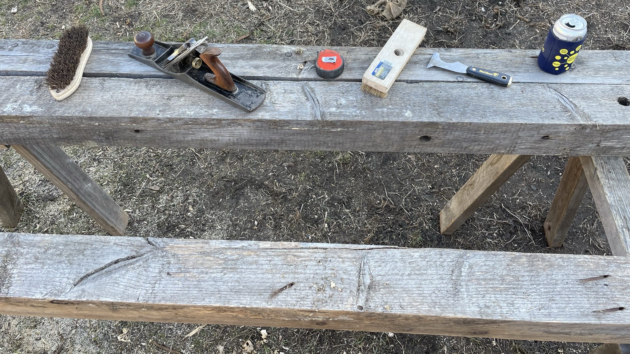 As I brushed and scraped the old timbers, I noticed the familiar motions were just that of bench work; I’d substituted my scrub plane for a scrub brush. Looking down at the neat row of rough timbers I realized I had all the wood I needed for a new, proper, woodworking bench.