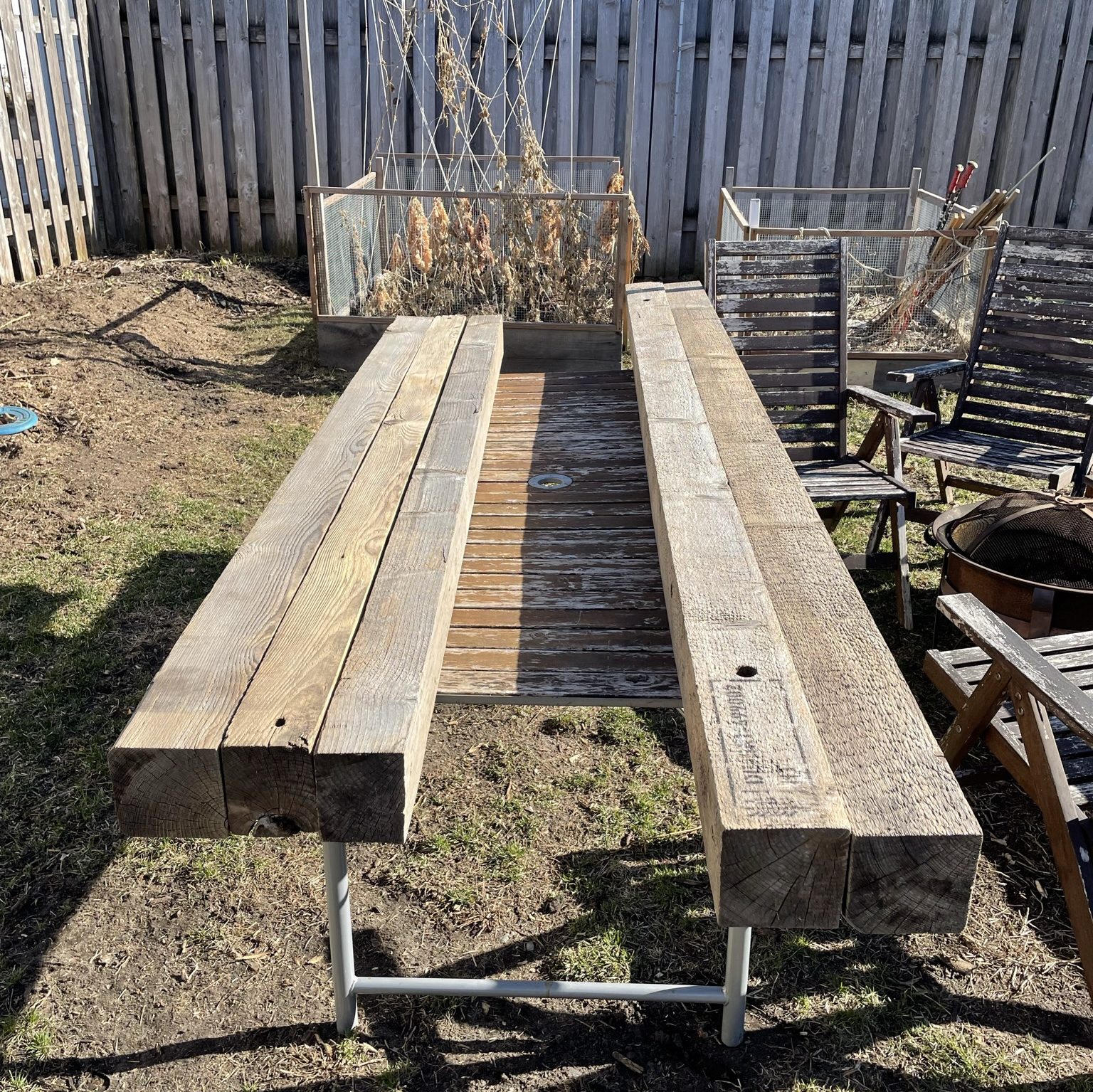Several years ago, my father in law found a pile of old timbers behind his office and offered them to me for whatever wild building idea I could come up with. We keep a vegetable garden and for years have lusted for a dedicated greenhouse to stretch our growing season (it’s time the rows of seedlings on the fold-up card table flew the coop). Naturally, our first idea for the timbers was to construct a timber-framed green house adjoining our garage. With more portable, lighter, and more reliable alternatives available, we have put that idea aside. The timbers have since languished in our garage, that is, until this spring.