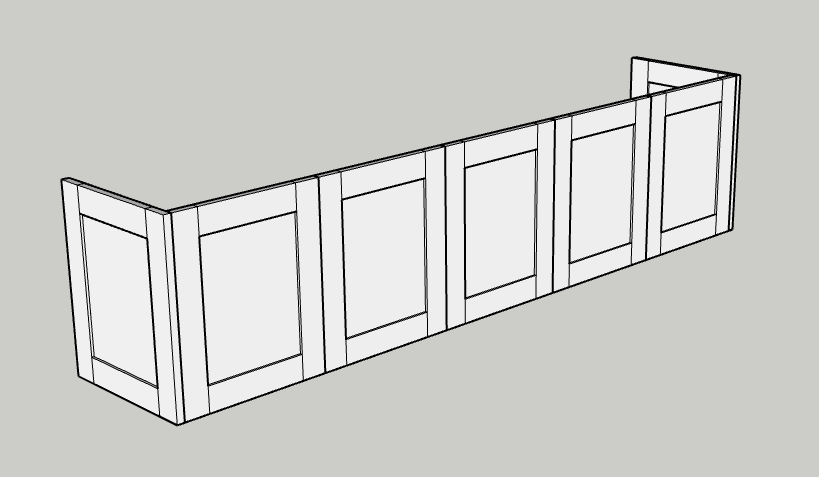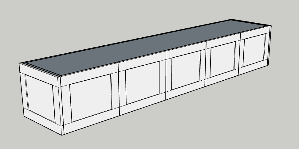 The bench design is formulated on a base-unit: the prefinished door panel. The length is an increment of one of the side dimensions. Proportions of the overall bench are dependent on the orientation of the panels and the number of panels used in the project. With 7 panels I have a variety of permutations. I want to use one panel for each side to provide an appealing finished end surface, leaving 5 panels to use along the face of the bench.